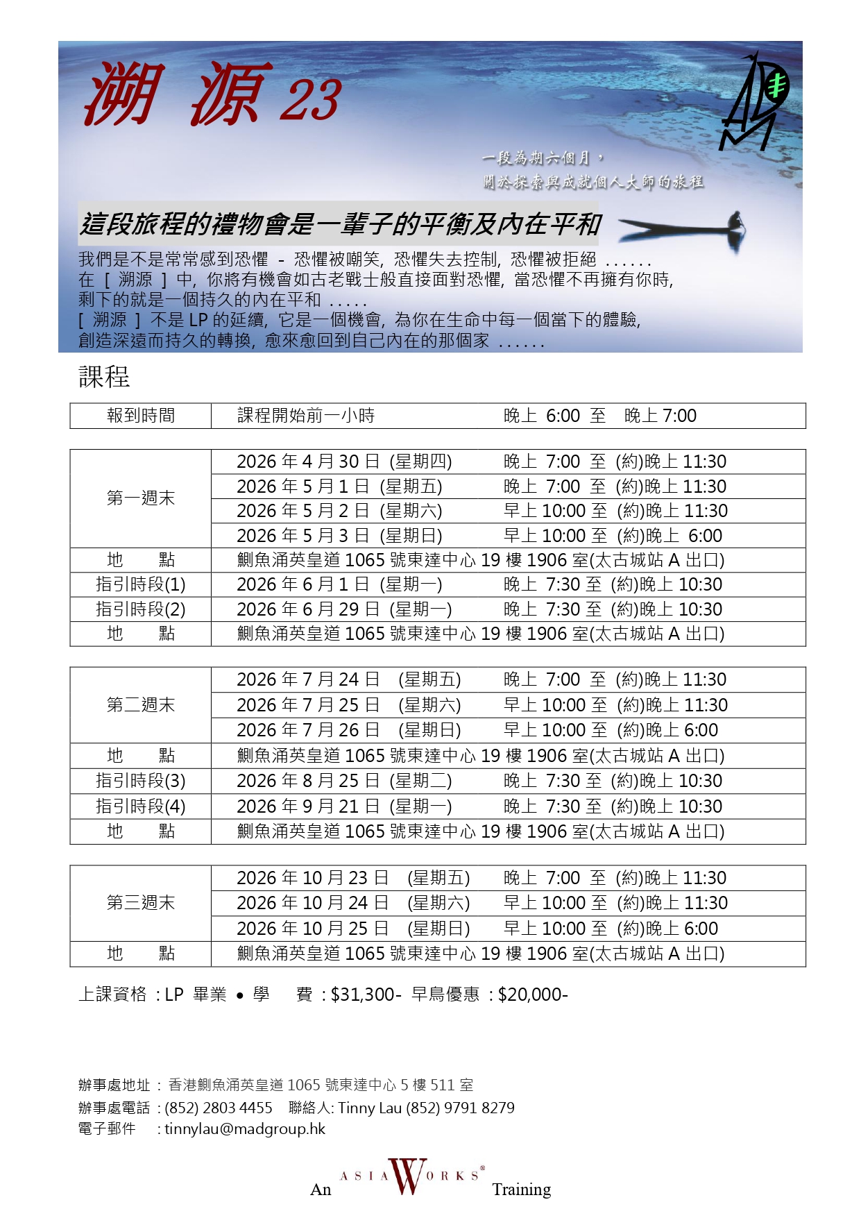 溯源的架构是建立於每天的练习上。在课程期间,你会在每天指定的阅读中有所启发、有所挑战,这些指定的阅读是精选自世界上伟大的哲学、文学及心灵著作,来自於东、西方的传统精华。另外,有架构性的每日写作,会协助你加深且厘清你的体验,也会纪录你个人在这趟探索之旅程的进展。为了支持你达到平衡、专注及清晰,我们还提供每日放松的养生法、肢体运动及冥想。在规律的练习中,你可以完全将这些新的存在方式整合到生活中。